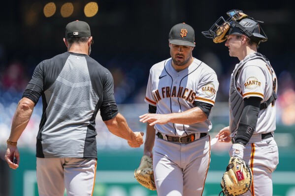 San Francisco Giants manager Gabe Kapler, left, relieves starting pitcher Scott Alexander, with catcher Patrick Bailey, during the first inning against the Washington Nationals at Nationals Park in DC on Sun Jul 23, 2023 (AP News photo)