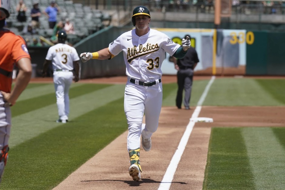 Oakland A’s JJ Bleday head home after hitting his eighth home run of the season in the bottom of the first inning against the Houston Astros at the Oakland Coliseum on Sun Jul 23, 2023 (AP News photo)