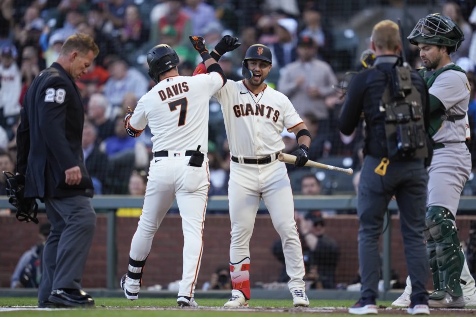 San Francisco Giants’ J.D. Davis (7) celebrates with Michael Conforto after hitting a two-run home run against the Oakland Athletics during the first inning at Oracle Park in San Francisco on Wed Jul 26, 2023 (AP News photo)