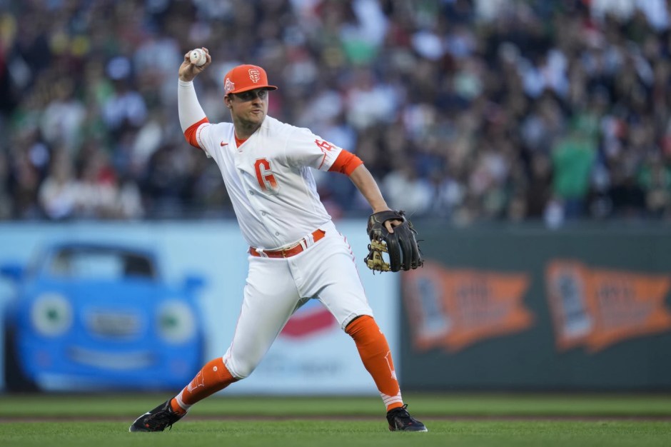 San Francisco Giants third baseman J.D. Davis throws to first for an out on Oakland Athletics’ Nick Allen during the third inning at Oracle Park in San Francisco on Wed Jul 26, 2023 (AP News photo)