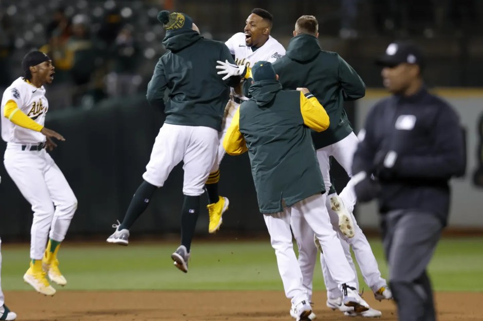 Oakland Athletics’ Tony Kemp, center, celebrates with teammates after driving in the winning run against the Cleveland Guardians during the ninth inning at the Oakland Coliseum Tue Apr 4, 2023. Kemp is being sought by other MLB clubs with other A’s players before the Aug 1, 2023 trade deadline. (AP News photo)