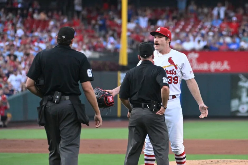 St Louis Cardinal pitcher Miles Mikolas seems perplexed and questions why umpires threw him out of the Thu Jul 27, 2023 game against the Chicago Cubs at Busch Stadium in St Louis after beaning Chicago Cubs hitter Ian Happ in the hip. (USA Today photo)