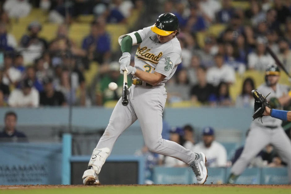 The Oakland A’s Tyler Soderstrom (37) goes yard on Los Angeles Dodgers pitching in the top of the eighth inning at Dodger Stadium in Los Angeles. Soderstrom’s home run was one of two A’s runs for Thu Aug 4, 2023 (AP News photo)