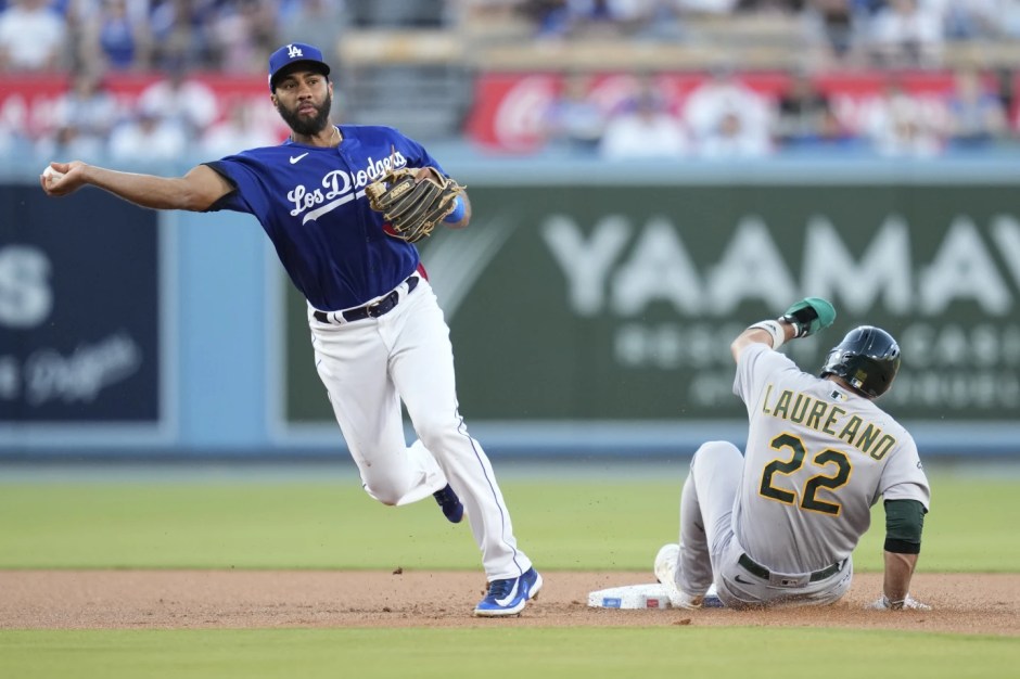 The Los Angeles Dodgers second baseman Amed Rosario (31) completes the double play on this throw as the Oakland A’s Ramon Laureano slides in too late in the top of the first inning at Dodger Stadium in Los Angeles on Thu Aug 3, 2023 (AP News photo)