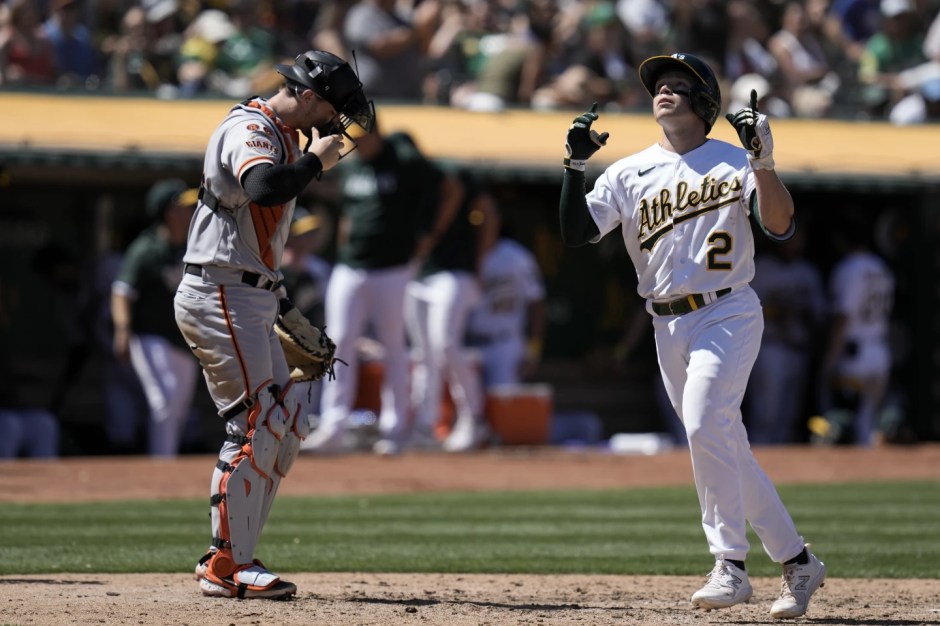 That didn’t last long. Wade hit another single in the top of the second, this one with runners on the corners and one away, made it 2-1, Giants. That changed with Tyler Soderstrom, who had walked, on first and two men out, when the good field, no hit shortstop Nick Allen parked a fly on the steps separating the left field grandstand from the bleachers. It was Allen’s second homer of the year and raised his batting average from .181 to .186. He ended the day at .195.