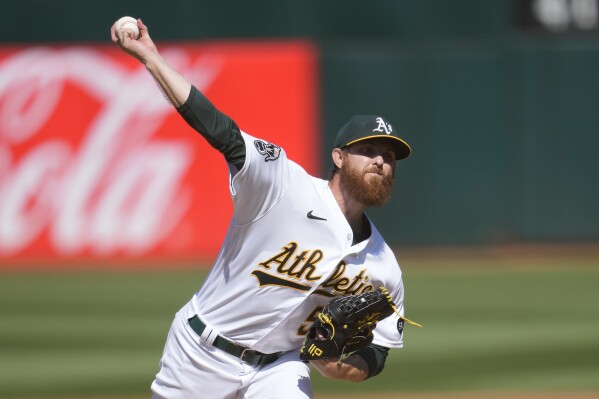 Oakland Athletics pitcher Paul Blackburn works against the San Francisco Giants during the first inning at the Oakland Coliseum Sat Aug 5, 2023. Blackburn will be the A’s starting pitcher this Fri Aug 11, 2023 at Nationals Park in DC (AP News photo)