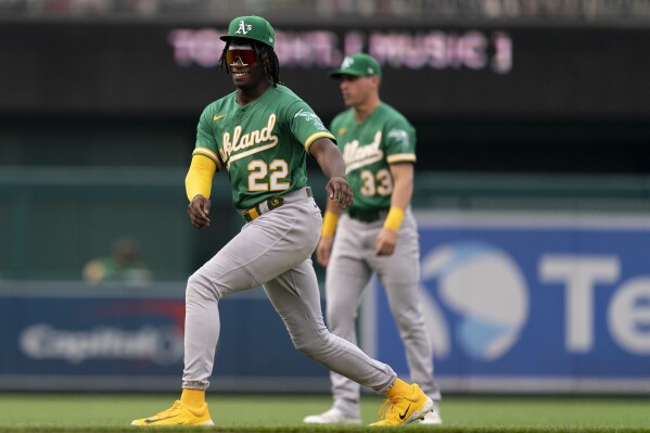 Oakland Athletics right fielder Lawrence Butler (22) warms up before the game against the Washington Nationals, Saturday, Aug. 12, 2023, in DC (AP News photo)