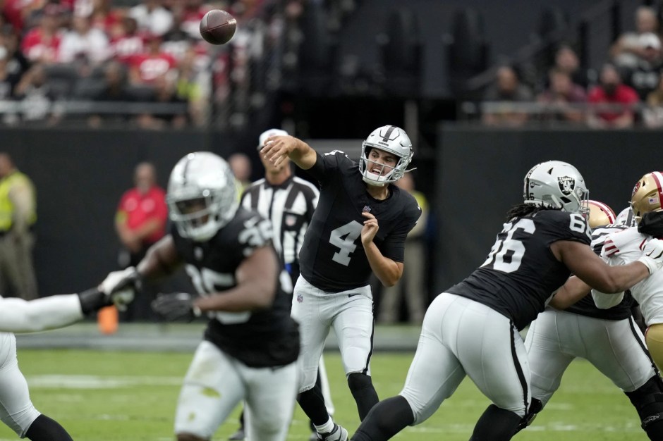 Las Vegas Raiders quarterback Aidan O’Connell (4) throws the ball against the San Francisco 49ers during the first half of an NFL preseason football game, Sunday, Aug. 13, 2023, in Las Vegas. (AP News photo)