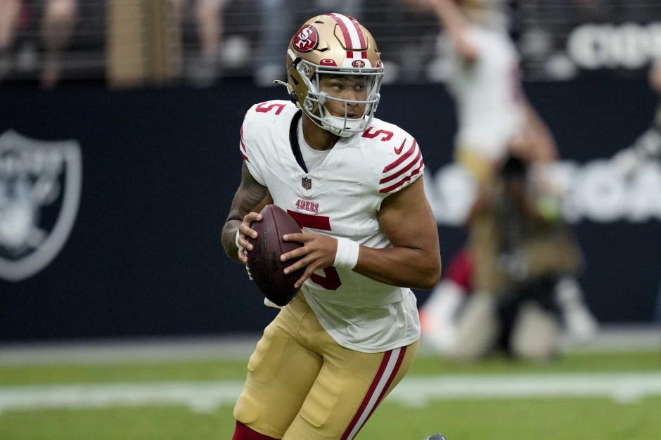 San Francisco 49ers quarterback Trey Lance (5) drops backs to pass against the Las Vegas Raiders during the first half of an NFL preseason football game, Sunday, Aug. 13, 2023, in Las Vegas. (AP News photo)