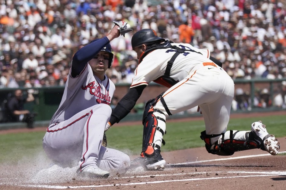 Atlanta Braves’ Austin Riley, left, scores against San Francisco Giants catcher Patrick Bailey during the first inning at Oracle Park in San Francisco Sat Aug 25, 2023 (AP News photo)