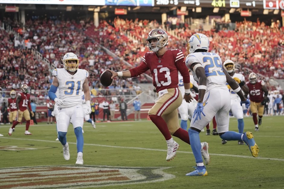 San Francisco 49ers quarterback Brock Purdy runs into the end zone against the Los Angeles Chargers in pre season play at Levi Stadium in Santa Clara on Sat Aug 25, 2023 (AP News photo)