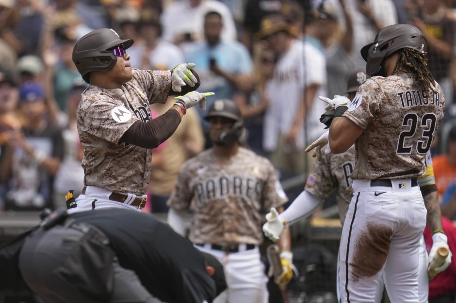 San Diego Padres’ Juan Soto, left, celebrates with teammate Fernando Tatis Jr. after hitting a two-run home run during the first inning at Petco Park in San Diego on Sun Sep 3, 2023 (AP News photo)
