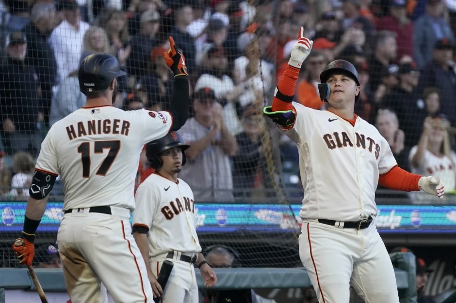 San Francisco Giants’ Joc Pederson, right, celebrates with Mitch Haniger (17) after hitting a home run against the Colorado Rockies during the fifth inning at Oracle Park in San Francisco on Sun Sep 10, 2023 (AP News photo)
