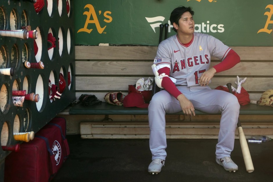 Los Angeles Angels’ Shohei Ohtani before a baseball game against the Oakland Athletics in Oakland, Calif., Sunday, Sept. 3, 2023. Ohtani will miss the rest of the season because of an oblique injury, the team announced, Saturday, Sept. 16, 2023. (AP News photo)