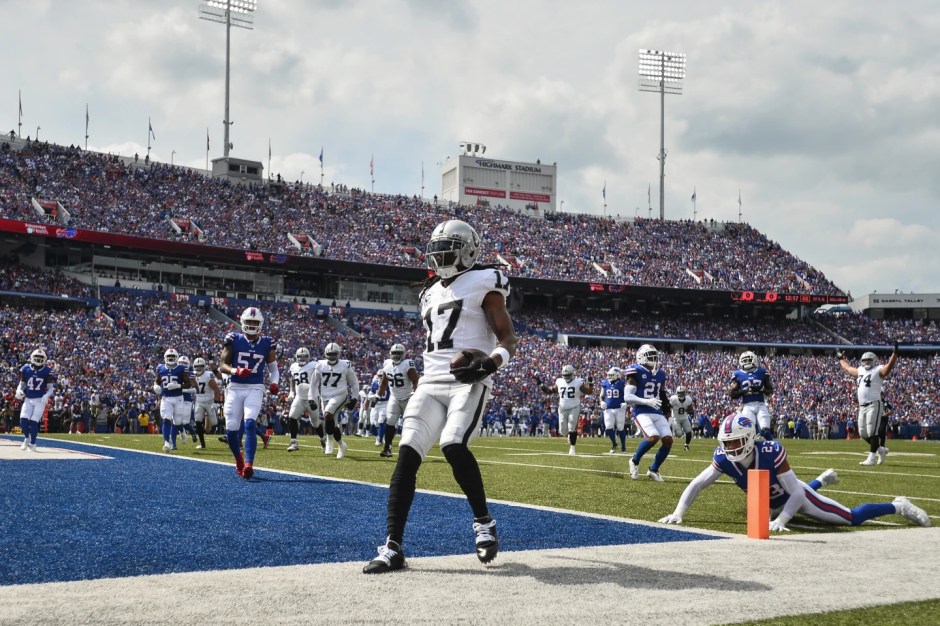 The Las Vegas Raiders wide receiver DeVante Adams scores the only touchdown the Raiders would have for the game in the first half against the Buffalo Bills at Highmark Stadium Orchard Park NY on Sun Sep 17, 2023 (AP News photo)