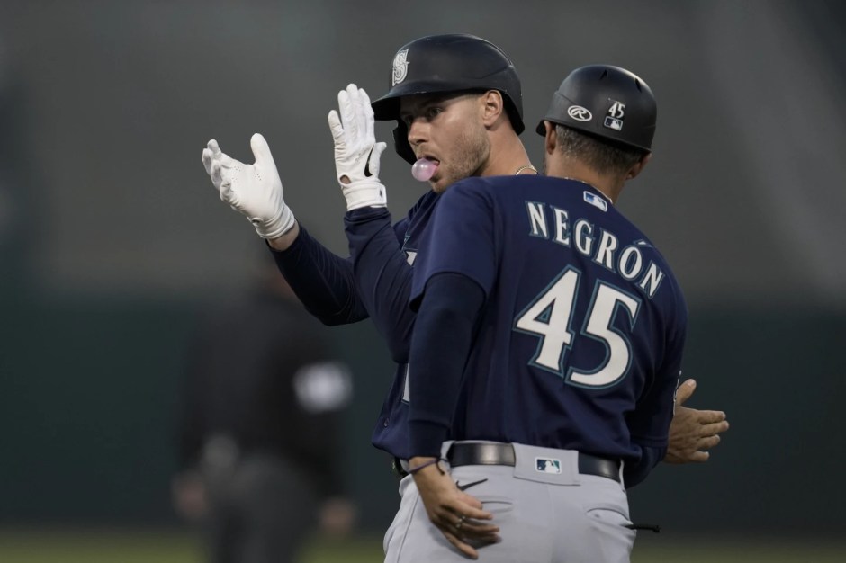 Seattle Mariners’ Jarred Kelenic, left, celebrates next to first base coach Kristopher Negrón after hitting an RBI single against the Oakland Athletics during the second inning at the Oakland Coliseum on Tue Sep 19, 2023 (AP News photo)