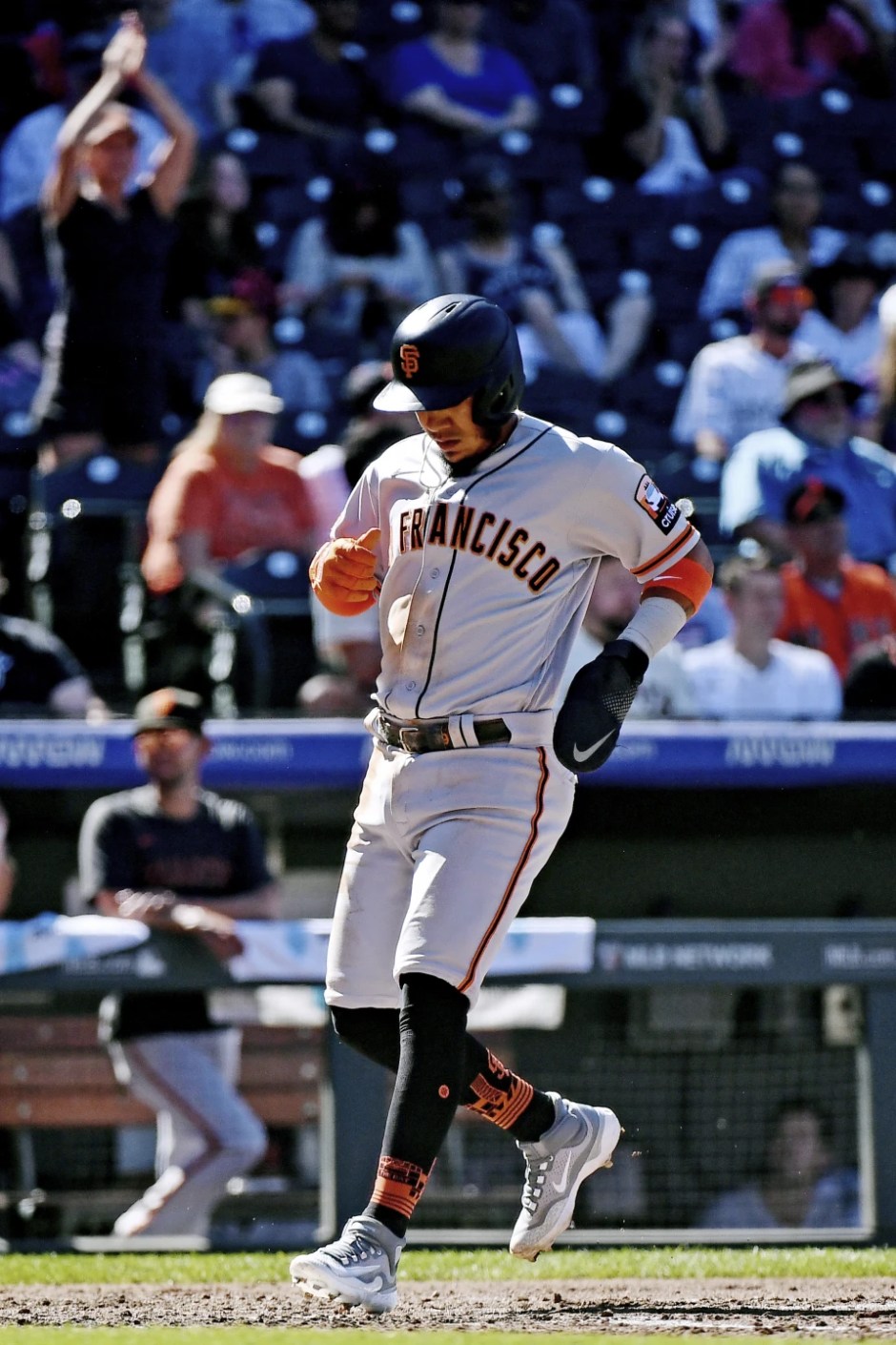 Thairo Estrada crossed the plate after slugging a sixth inning home run against the Colorado Rockies at Coors Field in Denver on Sun Sep 17, 2023 (AP News photo)