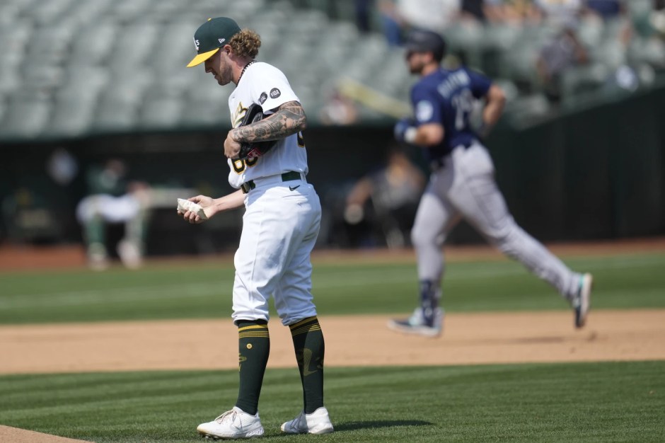 Oakland Athletics pitcher Joey Estes, left, reacts after allowing a home run to Seattle Mariners’ Cal Raleigh, right, during the fifth inning at the Oakland Coliseum on Wed Sep 20, 2023 (AP News photo)