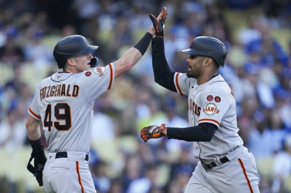 San Francisco Giants’ LaMonte Wade Jr., right, celebrates with Tyler Fitzgerald after they both scored off of a home run hit by Wade Jr. during the fifth inning against the Los Angeles Dodgers at Dodgers Stadium on Sun Sep 24, 2023 (AP News photo)