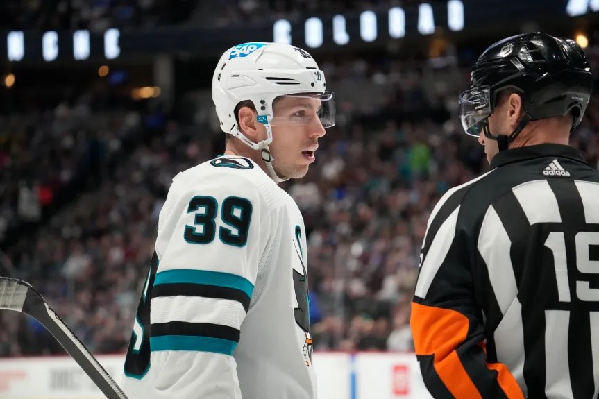 San Jose Sharks center Logan Couture, left, confers with referee Gord Dwyer in the third period of an NHL hockey game against the Colorado Avalanche Tuesday, March 7, 2023, in Denver. (AP file photo)