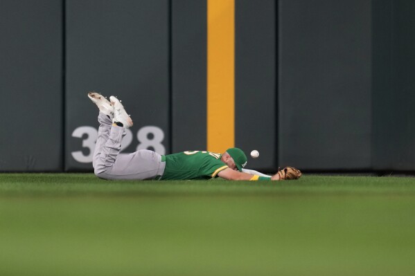 Oakland Athletics left fielder Seth Brown lies on the ground after trying to catch an RBI double by Minnesota Twins’ Kyle Farmer during the second inning at Target Field in Minneapolis on Wed Sep 27, 2023 (AP News photo)