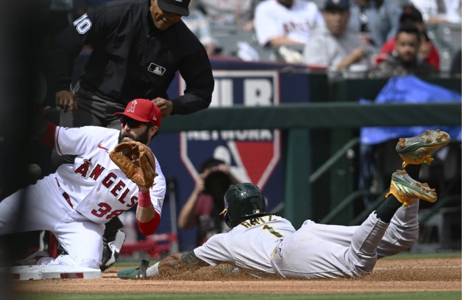 Los Angeles Angels third baseman Michael Stefanic (38) waits for the throw as Oakland Athletics Esteury Ruiz (1) steals third base during the third inning at the Big A in Anaheim on Sun Oct 1, 2023 (AP News photo)