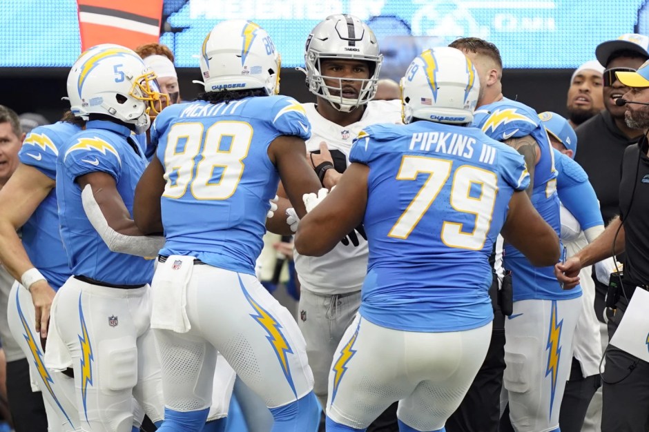 Las Vegas Raiders defensive tackle Jerry Tillery, center, is confronted by Los Angeles Chargers players after Tillery hit Chargers quarterback Justin Herbert late as Herbert ran out of bounds during the first half at So Fi Stadium in Inglewood on Sun Oct 1, 2023 (AP News photo)