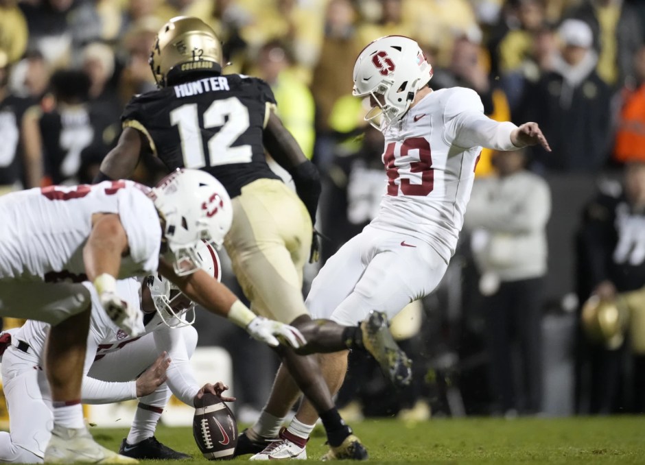 Stanford Cardinal kicker Joshua Karty boots a second overtime field goal to give the Cardinal a three point win over the Colorado Buffaloes in Boulder Colo on Fri Oct 13, 2023 (AP News photo)