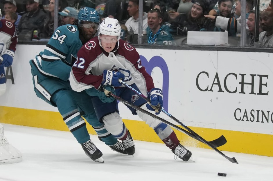 The Colorado Avalanche center Fredrik Oloffsson (22) tries to outskate the San Jose Sharks right winger Givani Smith (54) in second period at SAP Center in San Jose on Sat Oct 14, 2023 (AP News photo)