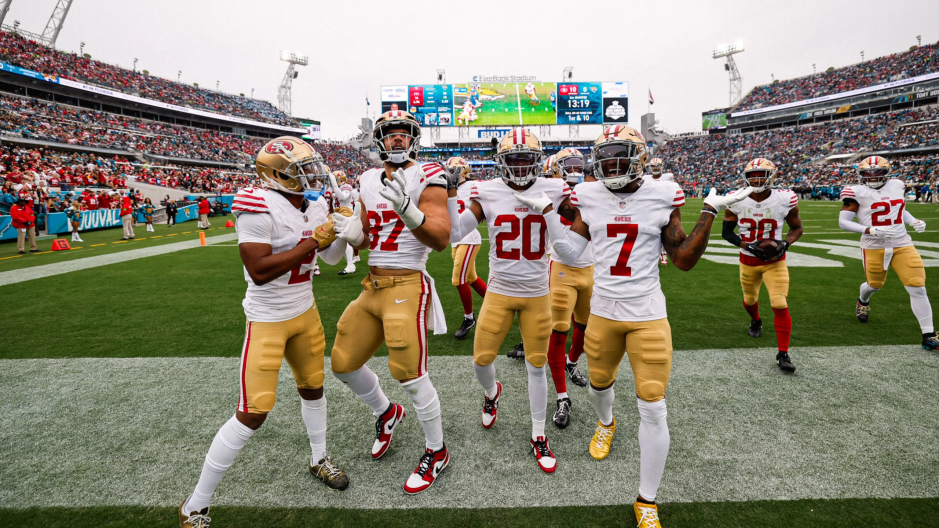 The San Francisco 49ers defense celebrates one of their four takeaways over the Jacksonville Jaguars at EverBank ST on Sunday NOV 12, 2023. (San Francisco 49ers).