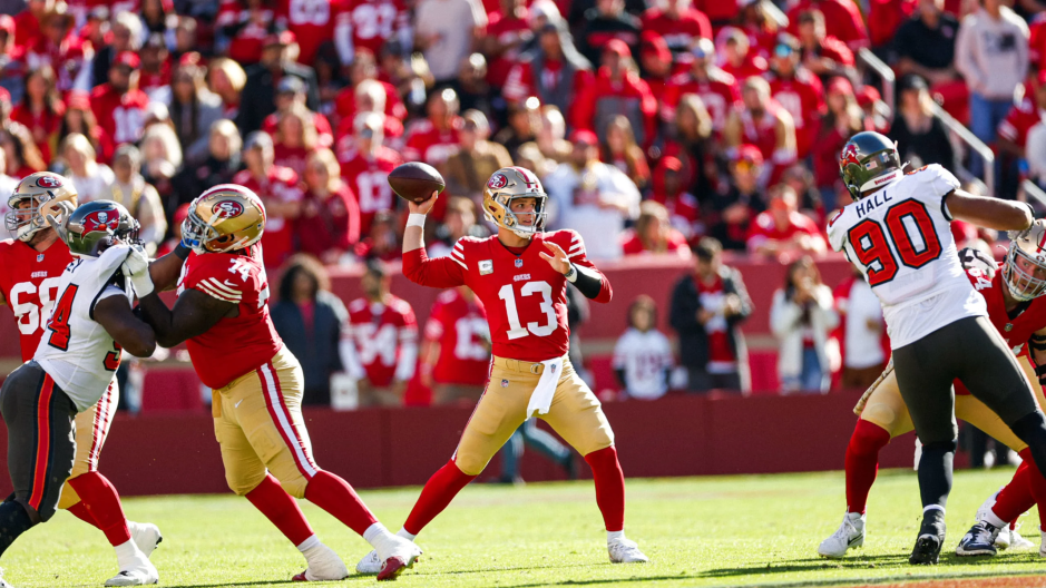 San Francisco 49ers quarterback Brock Purdy attempts a pass play against the Tampa Bay Buccaneers at Levi’s Stadium on Sunday NOV 19, 2023. (San Francisco 49ers)