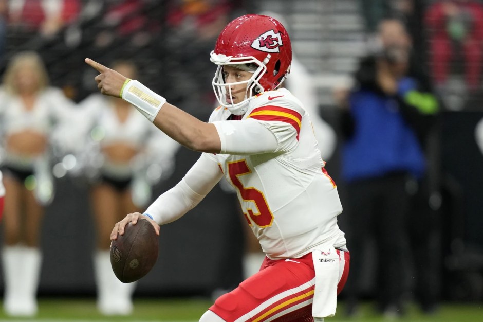 Kansas City Chiefs quarterback Patrick Mahomes (15) looks for a receiver against the Las Vegas Raiders in first half action at Allegiant Stadium in Las Vegas on Sun Nov 26, 2023 (AP News)