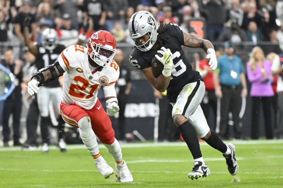 Las Vegas Raiders running back Jakobi Meyers (right) tries to outrun the Kansas City Chiefs safety Mike Edwards (left) in first half action at Allegiant Stadium in Las Vegas (AP News photo)