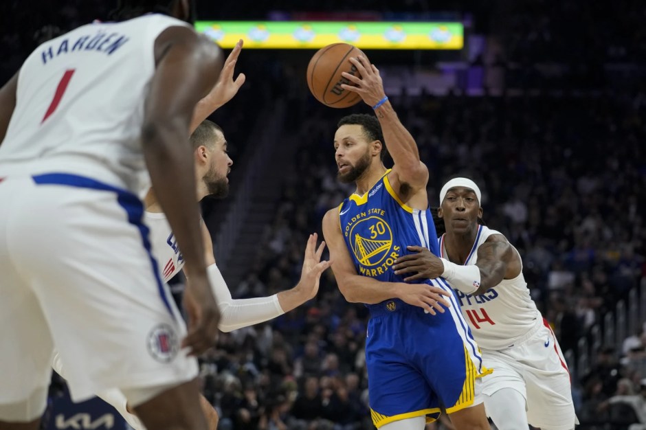 Golden State Warriors guard Stephen Cury (30) passes the ball against the Los Angeles Clippers forward Terrance Mann (right) and center Ivica Zubac (left) at the Chase Center in San Francisco on Thu Nov 30, 2023 (AP News photo)