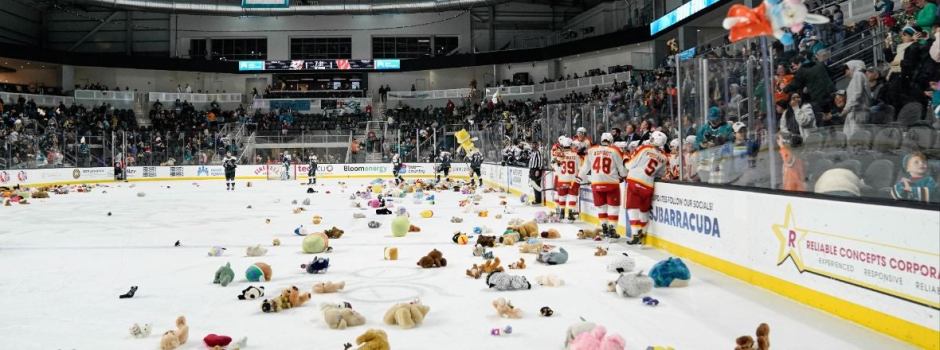 San Jose Barracuda fans participate in the Teddy Bear Toss after the Barracuda scored it’s first goal against the visiting Calgary Wranglers on Sat Dec 16, 2023 at Tech CU in San Jose (San Jose Barracuda photo)