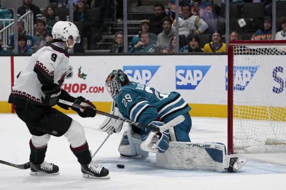 The Arizona Coyotes right wing Clayton Keller (9) scores on San Jose Sharks goaltender MacKenzie Blackwood (29) in the second period at SAP Center in San Jose on Thu Dec 21, 2023 (AP News photo)