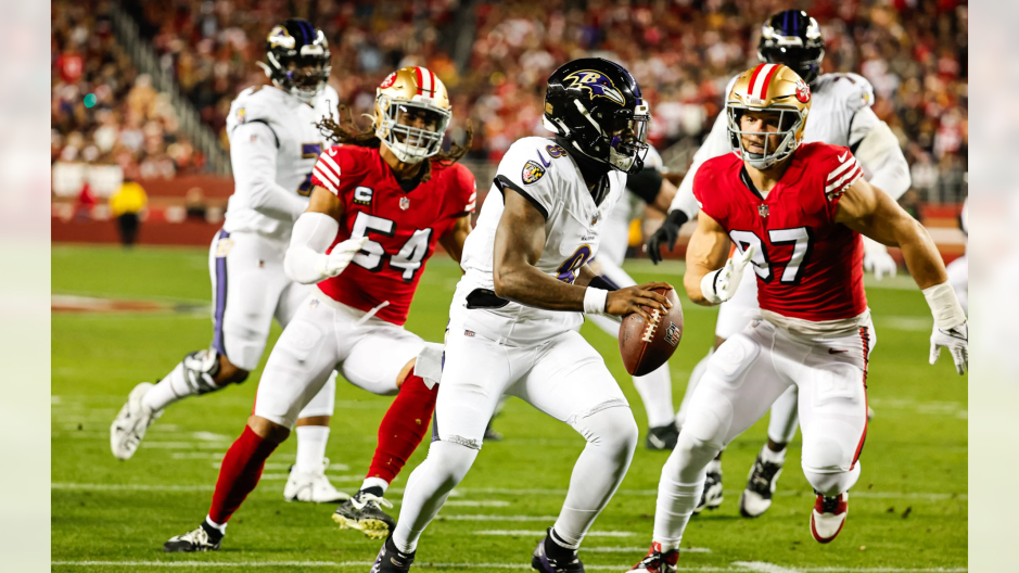 San Francisco 49ers defenders Fred Warner (#54) and Nick Bosa (#97) pursue Baltimore Ravens quarterback Lamar Jackson (#8) at Levi’s Stadium on Sunday DEC 25, 2023. (Kym Fortino-San Francisco 49ers)