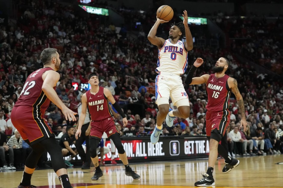 The Miami Heat defense guard Tyler Herro (14) and forward Caleb Martin (16) defend against the Philadelphia 76ers guard Tyrese Maxey (0) in the first half on Mon Dec 25, 2023 in Miami. The Heat who are on a three game win streak take on the Golden State Warriors Thu Dec 28, 2023 at the Chase Center in San Francisco (AP News photo)