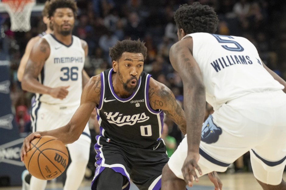 The Sacramento Kings guard Malik Monk (0) dribbles on the Memphis Grizzlies guard Vince Williams Jr (5) in the second half at FedEx Forum in Memphis on Sun Dec 31, 2023 (AP News photo)