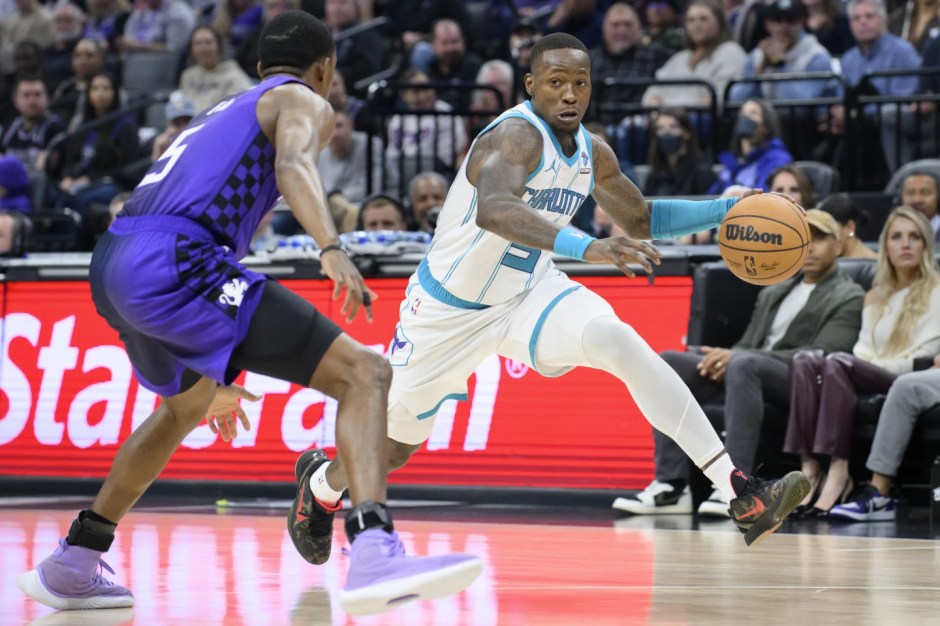 The Charlotte Hornets guard Terry Rozier right drives the lane on the Sacramento Kings guard De’Aaron Fox (5) in first quarter action at Golden 1 Center in Sacramento on Tue Jan 2, 2024 (AP News photo)