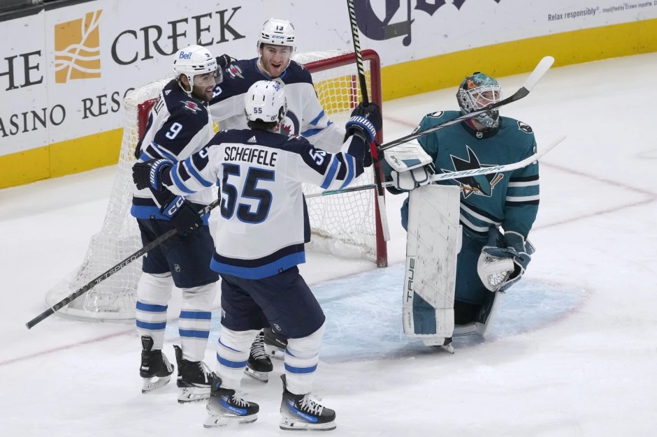 The Winnipeg Jets center Gabriel Vilardi (top) celebrates with left wing Alex Iafallo (9) and center Mark Scheifele (55) who scored against the San Jose Sharks goaltender MacKenzie Blackwood (29) in the third period at SAP Center in SanJose (AP News photo)