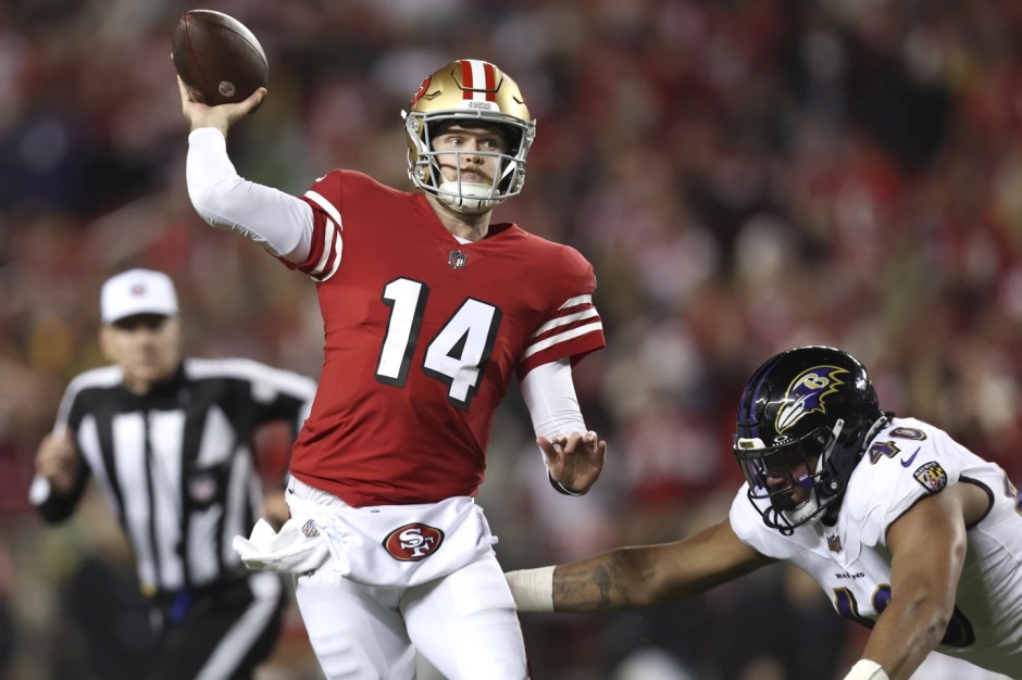 Although the San Francisco 49ers didn’t win this game 49ers backup quarterback Sam Darnold (14) got some reps in against the Baltimore Ravens and linebacker Malik Harrison (40) in the second half on Mon Dec 25, 2023 at Levi Stadium in Santa Clara. Darnold is slated to start against the Los Angeles Rams Sun Jan 7, 2024. (AP News photo)
