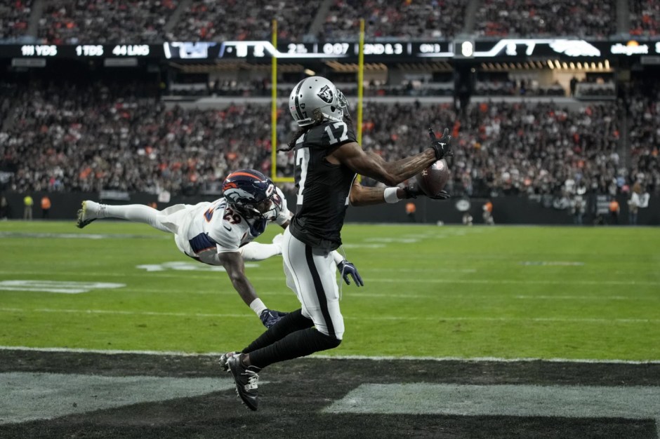 The Denver Broncos cornerback Ja’Quan McMillan (29) takes a diving stab at the Las Vegas Raiders wide receiver DeVante Adams (17) who catches the football for a touchdown in the first half at Allegiant Stadium in Las Vegas on Sun Jan 7, 2024 (AP News photo)