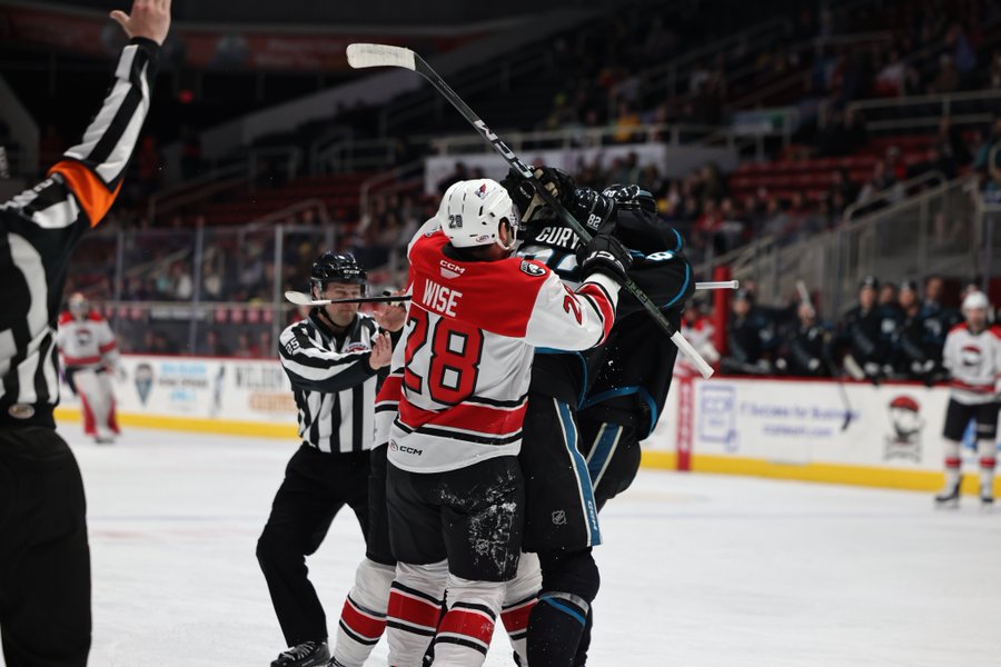 Charlotte Checkers forward Jake Wise battles with San Jose Barracuda defenseman Artem Guryev after the whistle is blown during the Checkers 4-1 win at Bojangles Coliseum on Wednesday JAN 17, 2024. (Charlotte Checkers)