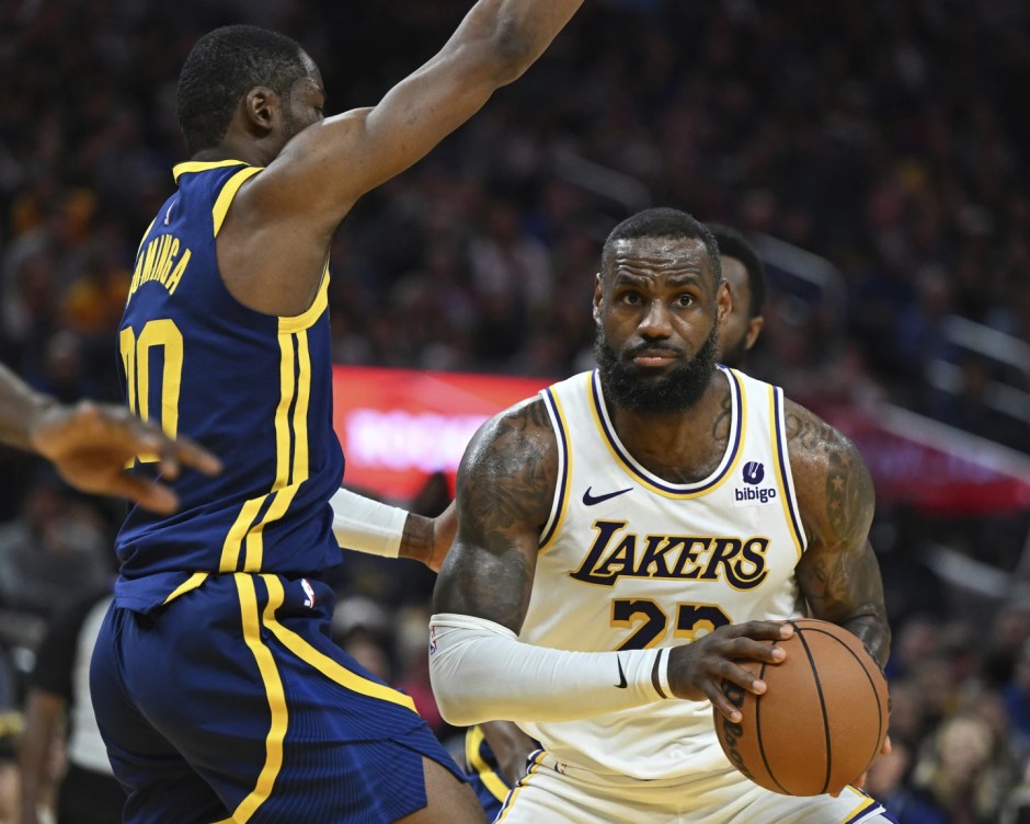 The Golden State Warriors forward Jonathan Kuminga (left) tries to defend the Los Angeles Lakers forward LeBron James (23) at Chase Center in San Francisco on Sun Jan 28, 2024 (AP News photo)