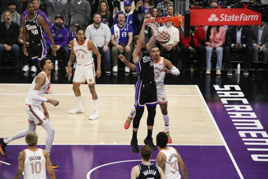 The Sacramento Kings Domantas Sabonis dunks on the San Antonio Spurs at Golden 1 Center in Sacramento on Thu Feb 22, 2024 (photo by Mauricio Segura Sports Radio Service)