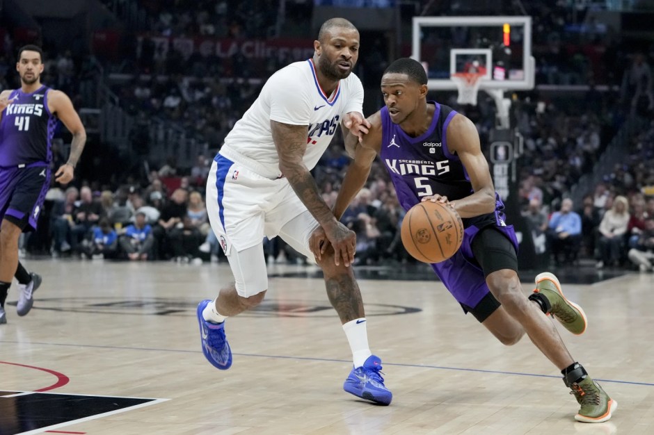 Sacramento Kings guard De’Aaron (5) drives the ball against Los Angeles Clippers forward PJ Tucker during the first half at Crypto.com Arena in Los Angeles Sun Feb 25, 2024 (AP News photo)