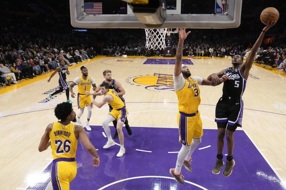 Los Angeles Lakers forward Anthony Davis (3) defends and the Sacramento Kings guard De’Aaron Fox (5) tries to get the shot in first half action at Crypto.com Arena in Los Angeles on Wed Mar 6, 2024 (AP News photo)