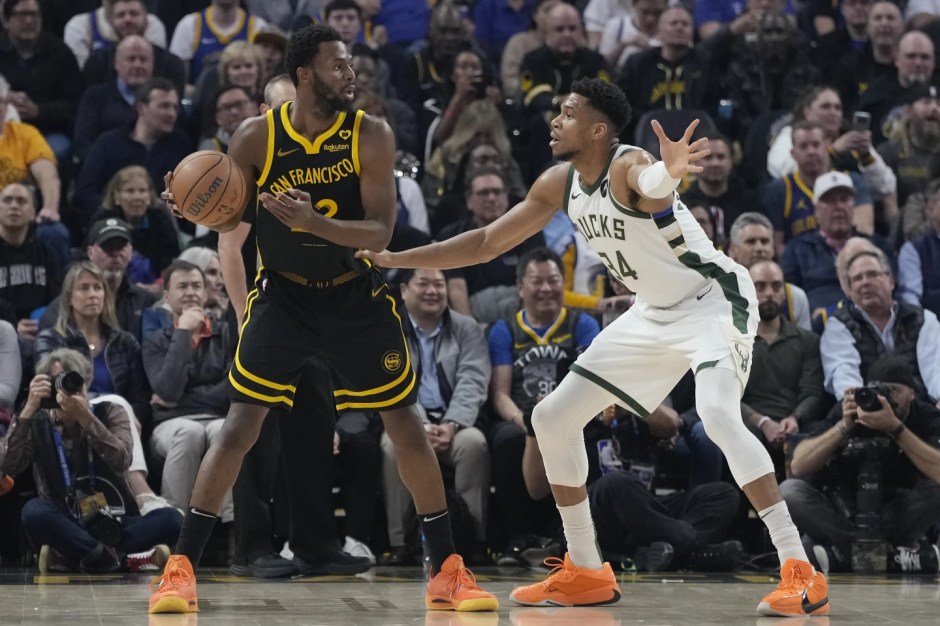Golden State Warriors forward Andrew Wiggins looks to pass the ball against the Milwaukee Bucks forward Giannis Antetokounmpo (34) in the first half at Chase Center in San Francisco on Wed Mar 6, 2024 (AP News photo)