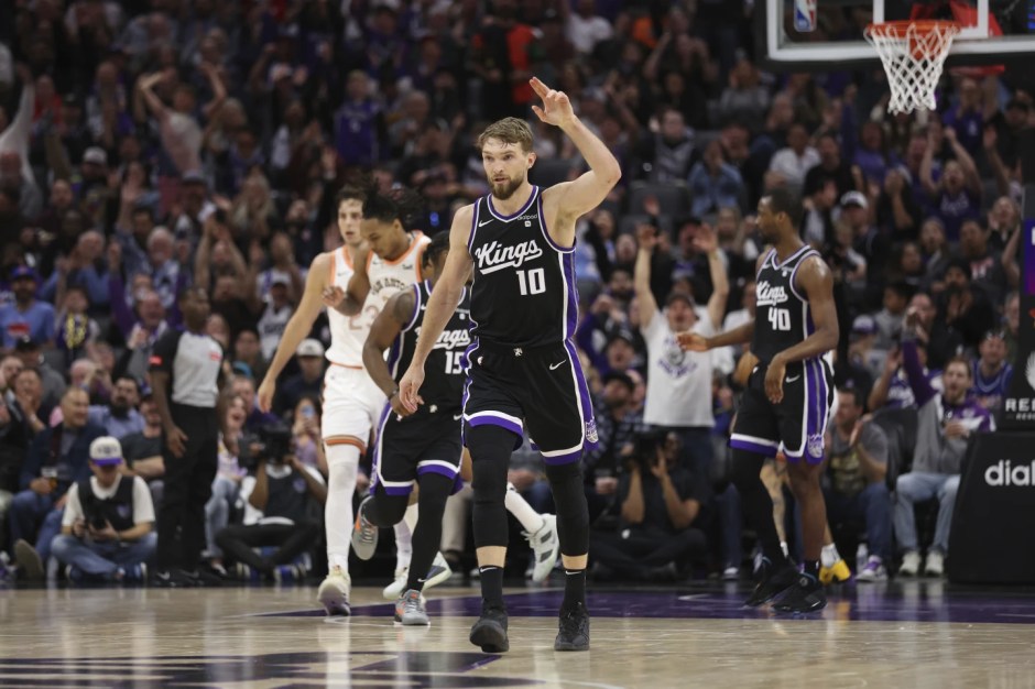 Forward Domantas Sabonis (10) takes off down the floor after scoring against the San Antonio Spurs in the second half at Golden 1 Center in Sacramento on Thu Mar 7, 2024 (AP News photo)